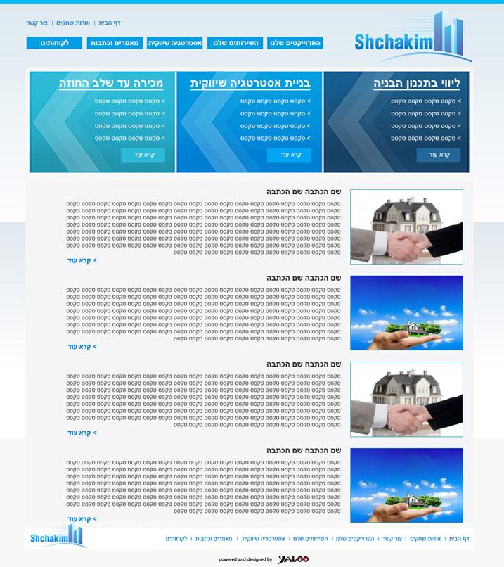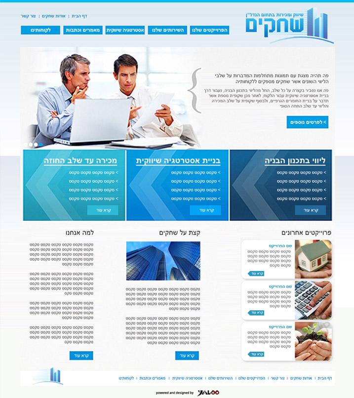 >> בעיצוב האתר שמרנו על קו נקי על בסיס צבעי הלוגו - לבן וכחול. יצרנו מצגת תמונות מרשימה כבר בדף הבית ומיתגנו את החברה כאחת שמובילה בתחום השיווק והמכירות בתחום הנדל"ן.