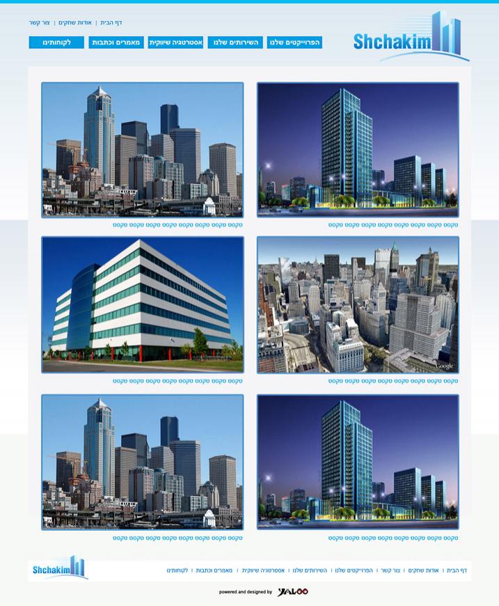 >> בדפי הגלריה נתנו מקום של כבוד לכל פרוייקט שנעשה על ידי שחקים. כל תמונה מוגדלת ואף יוצרת אחריה גם פירוט מלא עבור כל הפורטפוליו של החברה. כל זאת כמובן תוך שמירה מוקפדת על איכות ונוחות המשתמש.